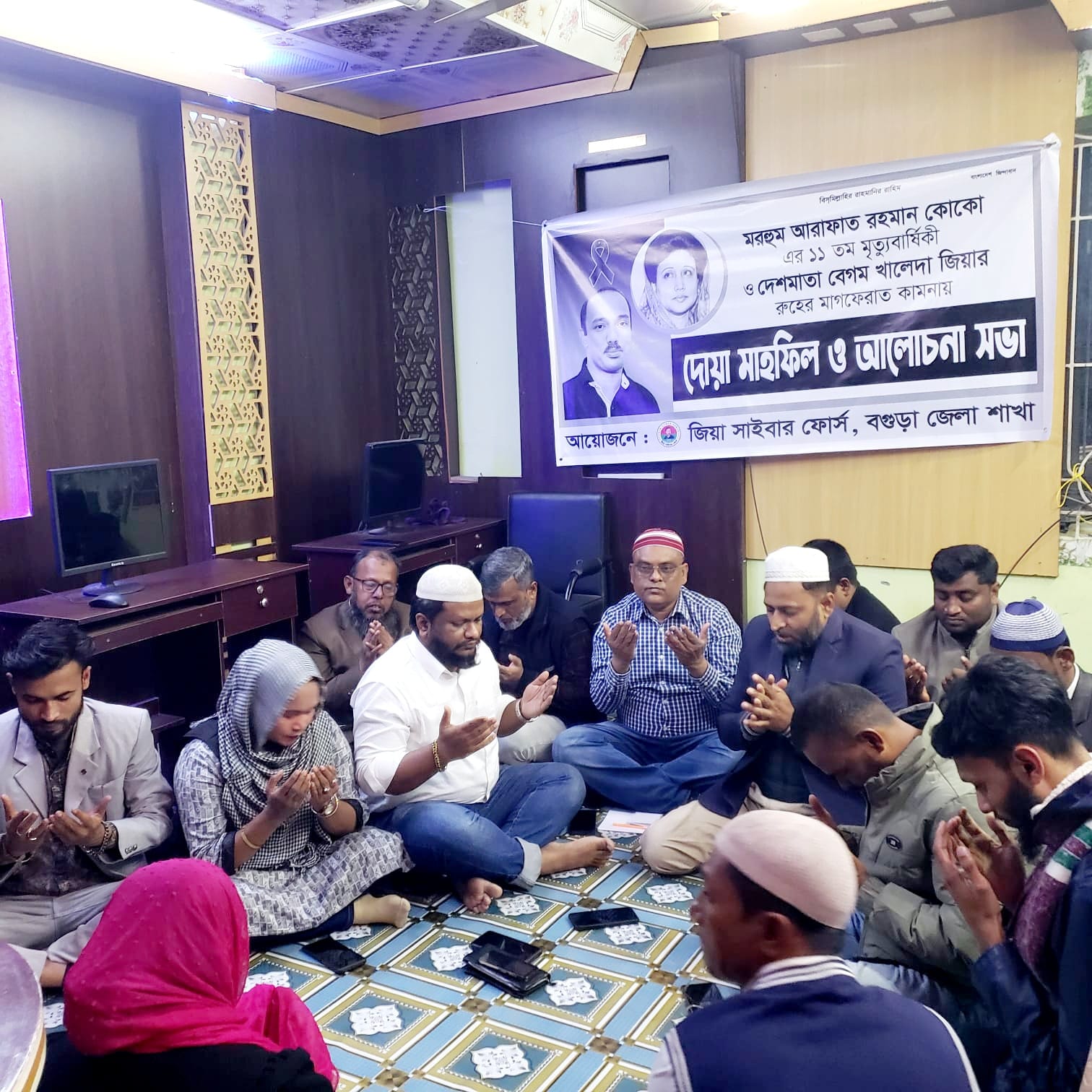 নিজস্ব প্রতিবেদক : শহীদ রাষ্ট্রপতি জিয়াউর রহমান ও আপোষহীন দেশনেত্রী, সাবেক প্রধানমন্ত্রী মরহুমা বেগম খালেদা জিয়ার কনিষ্ঠ পুত্র এবং বিএনপির ভারপ্রাপ্ত চেয়ারম্যান তারেক রহমানের আদরের ছোটভাই, বিশিষ্ট ক্রীড়ানুরাগী মরহুম আরাফাত রহমান কোকোর ১১তম মৃত্যুবার্ষিকী উপলক্ষে জিয়া সাইবার ফোর্স বগুড়া জেলা শাখার উদ্যোগে এক বিশেষ দোয়া মাহফিল অনুষ্ঠিত হয়েছে।