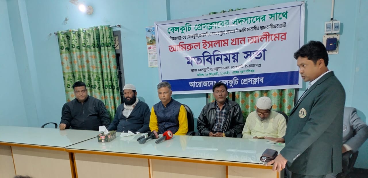 সিরাজগঞ্জ-৫ আসন (বেলকুচি ও চৌহালী উপজেলা) থেকে বিএনপি মনোনীত প্রার্থী আমিরুল ইসলাম খান আলিম বেলকুচি প্রেসক্লাবের সাংবাদিকদের সঙ্গে এক মতবিনিময় সভায় অংশগ্রহণ করেছেন।
