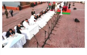 শপথগ্রহণ শেষে নথিতে স্বাক্ষর করেন মন্ত্রীরা। মঙ্গলবার সংসদ ভবনের দক্ষিণ প্লাজায়। ছবি: ভিডিও থেকে নেওয়া