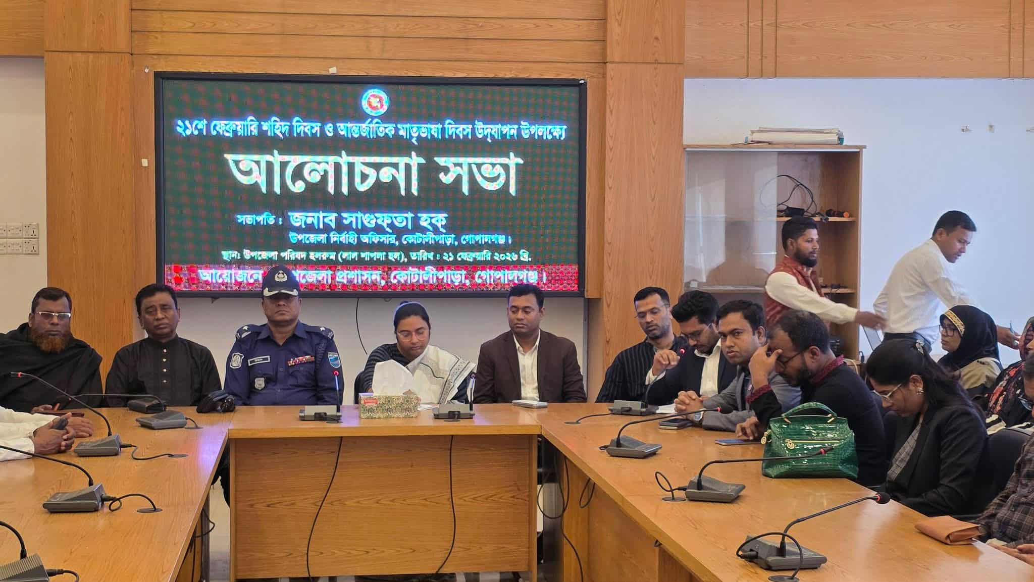 গোপালগঞ্জের কোটালীপাড়ায় বিনম্র শ্রদ্ধা ও যথাযথ মর্যাদায় মহান শহীদ দিবস ও আন্তর্জাতিক মাতৃভাষা দিবস পালন করা হয়েছে। দিবসটি উদযাপন উপলক্ষে উপজেলা প্রশাসনের আয়োজনে এক আলোচনা সভা অনুষ্ঠিত হয়। উপজেলা পরিষদ মিলনায়তনে (লাল শাপলা হল) আয়োজিত এই সভায় সভাপতিত্ব করেন কোটালীপাড়া উপজেলা নির্বাহী অফিসার (ইউএনও) সাগুফতা হক।