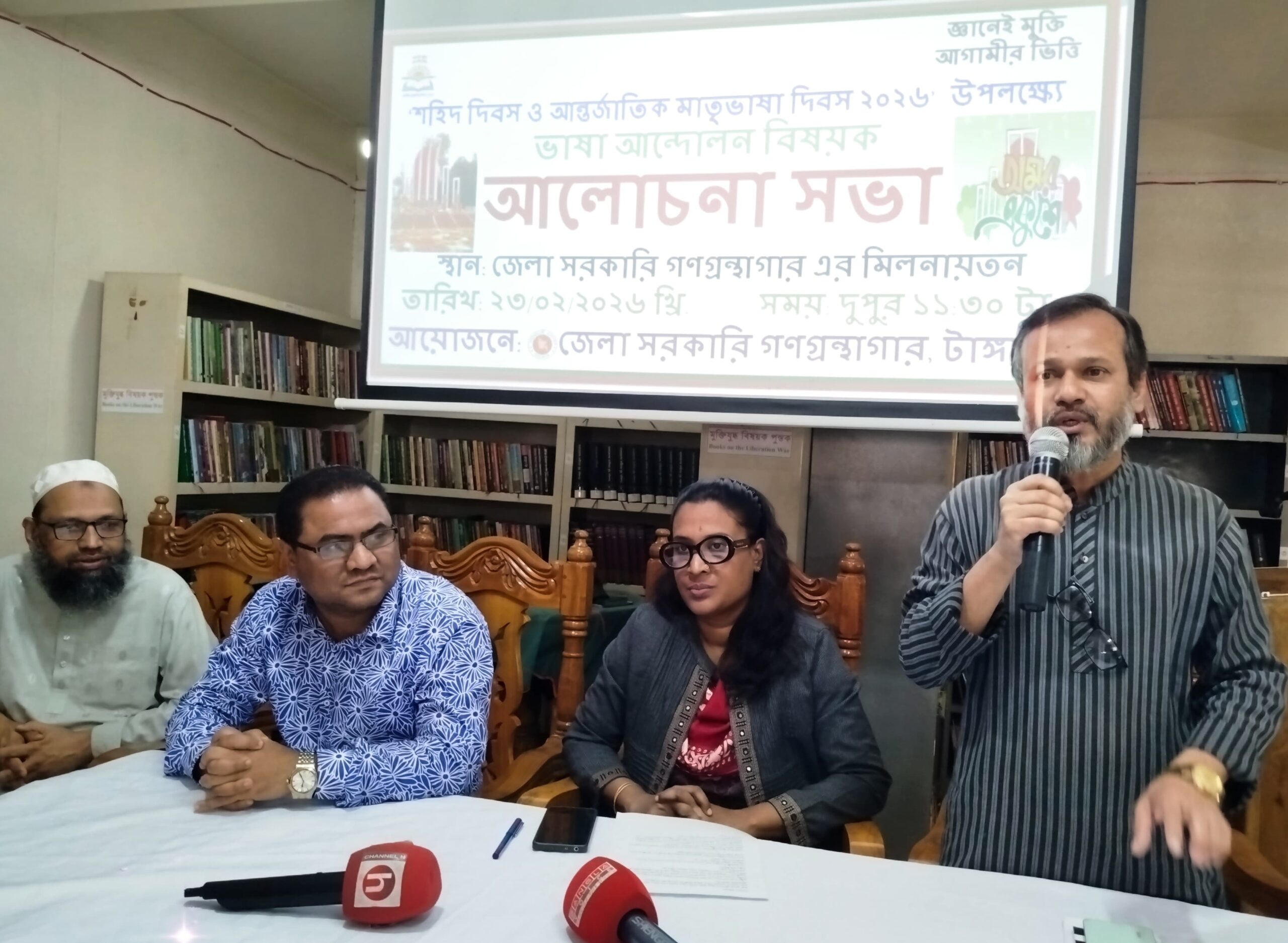 “জ্ঞানেই মুক্তি, আগামীর ভিত্তি” — এই প্রতিপাদ্যকে সামনে রেখে টাঙ্গাইলে মহান শহীদ দিবস ও আন্তর্জাতিক মাতৃভাষা দিবস ২০২৬ উদ্যাপন করা হয়েছে। সোমবার (২৩ ফেব্রুয়ারি) সকাল ১১টা ৩০ মিনিটে জেলা সরকারি গণগ্রন্থাগারের আয়োজনে টাঙ্গাইল জেলা গণগ্রন্থাগার মিলনায়তনে ভাষা আন্দোলন বিষয়ক এক আলোচনা সভা অনুষ্ঠিত হয়।
