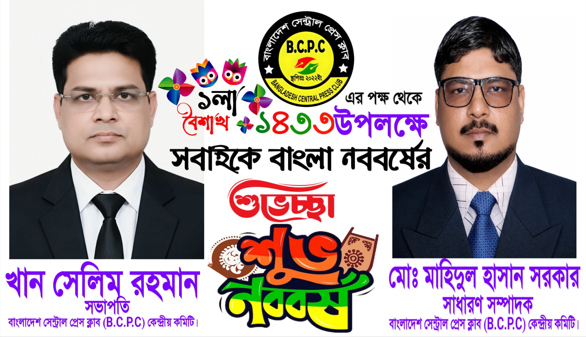 এসো হে বৈশাখ, এসো এসো — বাংলাদেশ সেন্ট্রাল প্রেস ক্লাব (B.C.P.C)-এর পক্ষ থেকে সবাইকে পহেলা বৈশাখ বাংলা নববর্ষের শুভেচ্ছা।