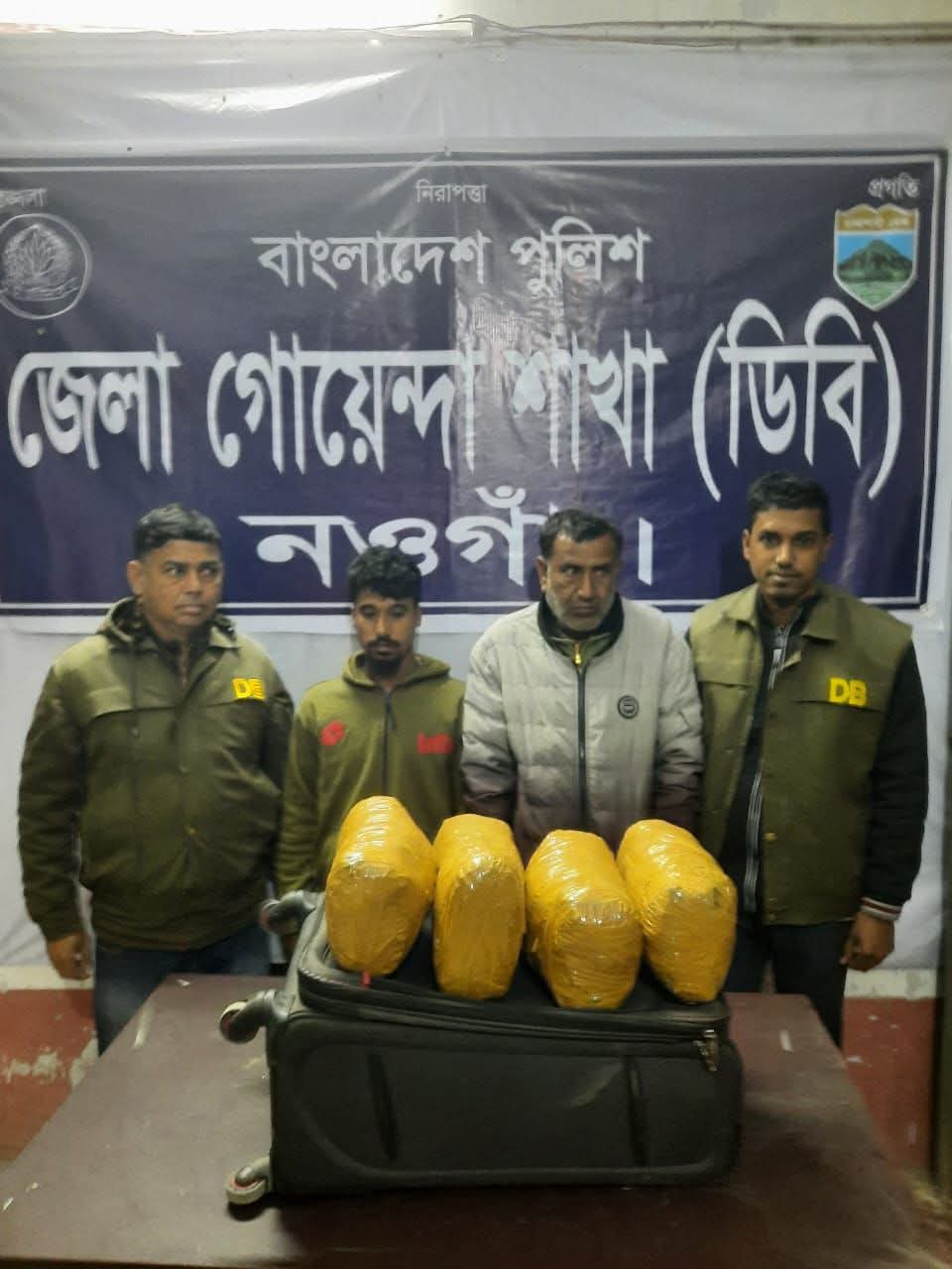 জেলা গোয়েন্দা পুলিশ জানায়, নওগাঁ জেলার পুলিশ সুপার মোহাম্মদ তারিকুল ইসলামের নির্দেশনায় জেলা গোয়েন্দা শাখা নওগাঁ ২০ ডিসেম্বর মাদকবিরোধী অভিযানে গোপন সংবাদের ভিত্তিতে রাত ১০টার সময় বদলগাছী মিনি স্টেডিয়ামের পশ্চিম পাশে অবস্থানরত দুইজন ব্যক্তিকে সন্দেহ হয়। তখন জেলা গোয়েন্দা শাখা নওগাঁ (ডিবি) আসামি আব্দুল্লাহ (২৪) এর হাতে থাকা লাগেজ তল্লাশি করে ৮ কেজি গাঁজা উদ্ধার করা হয়।