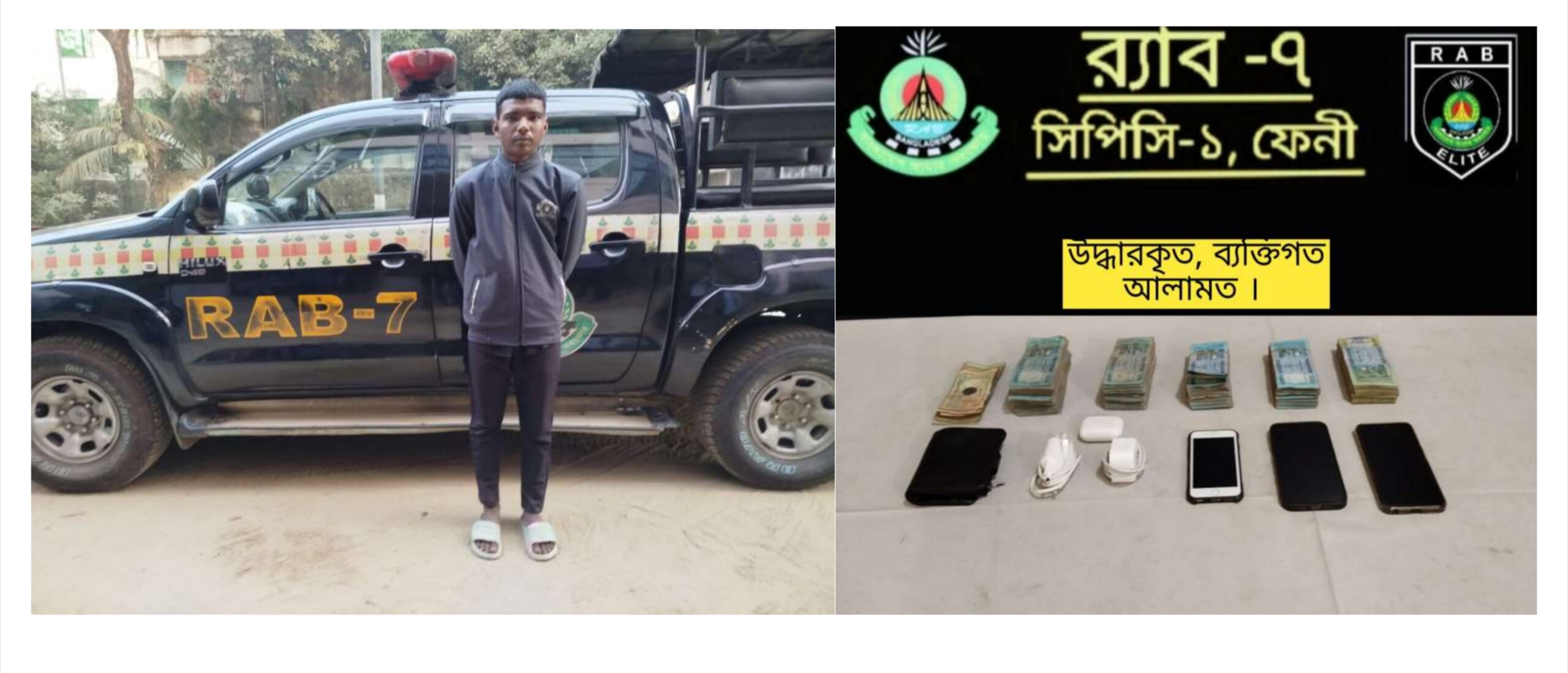 র্যাব-৬ জানায়, গোপন সংবাদের ভিত্তিতে আজ (বৃহস্পতিবার) বেলা ৩টা ৪৫ মিনিটে ফেনী সদর থানায় অভিযান চালানো হয়।