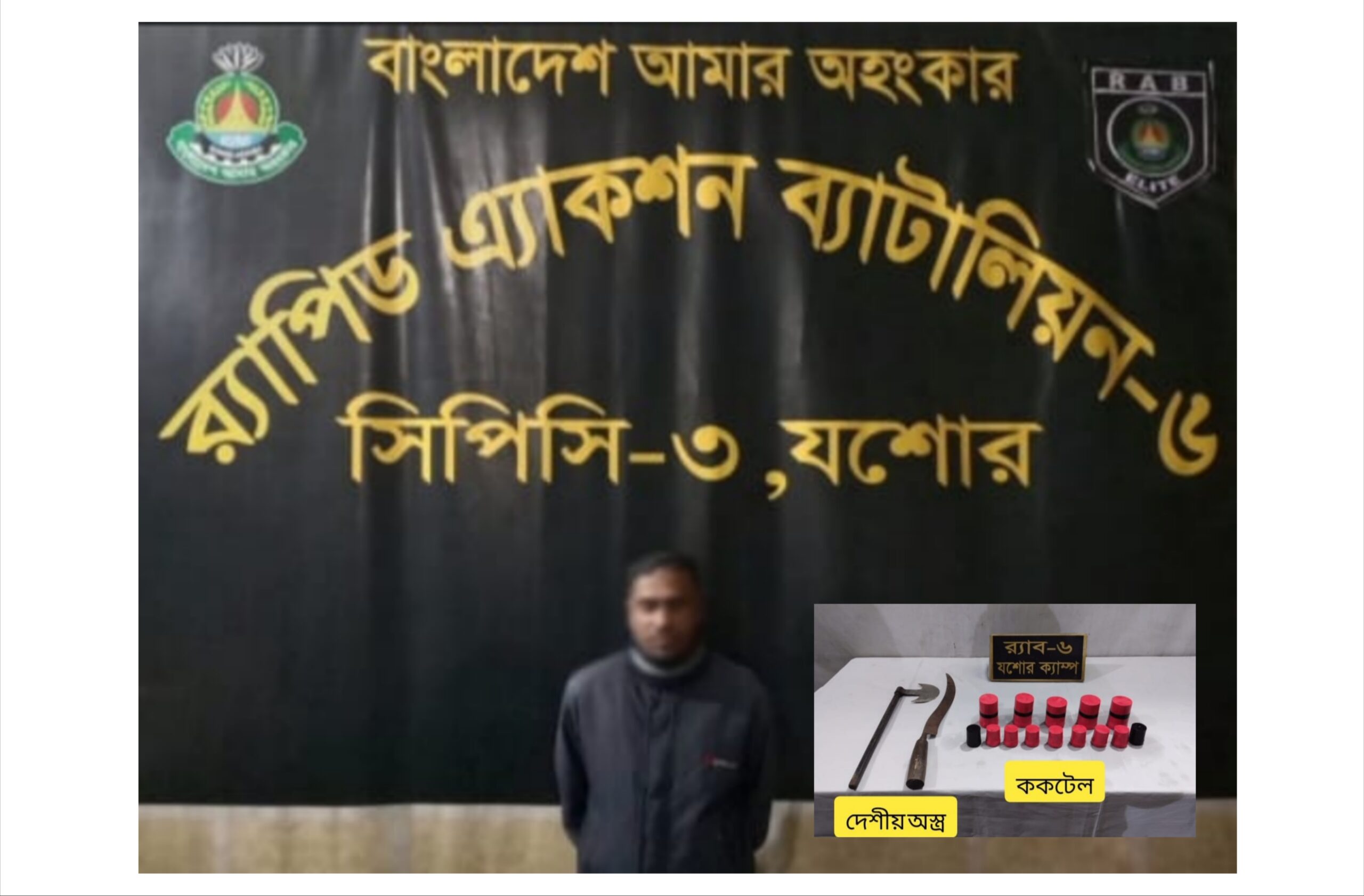 যশোরের বাঘারপাড়া উপজেলায় বড় ধরনের একটি নাশকতার পরিকল্পনা নস্যাৎ করেছে র্যাপিড অ্যাকশন ব্যাটালিয়ন (র্যাব-৬)। রোববার দিবাগত গভীর রাতে উপজেলার জামদিয়া ইউনিয়নের জয়রামপুর এলাকায় বিশেষ অভিযান চালিয়ে ১৪টি ককটেল ও দেশীয় অস্ত্রসহ কুখ্যাত সন্ত্রাসী মো. জামাল সরদার (৪৫) কে গ্রেপ্তার করা হয়।